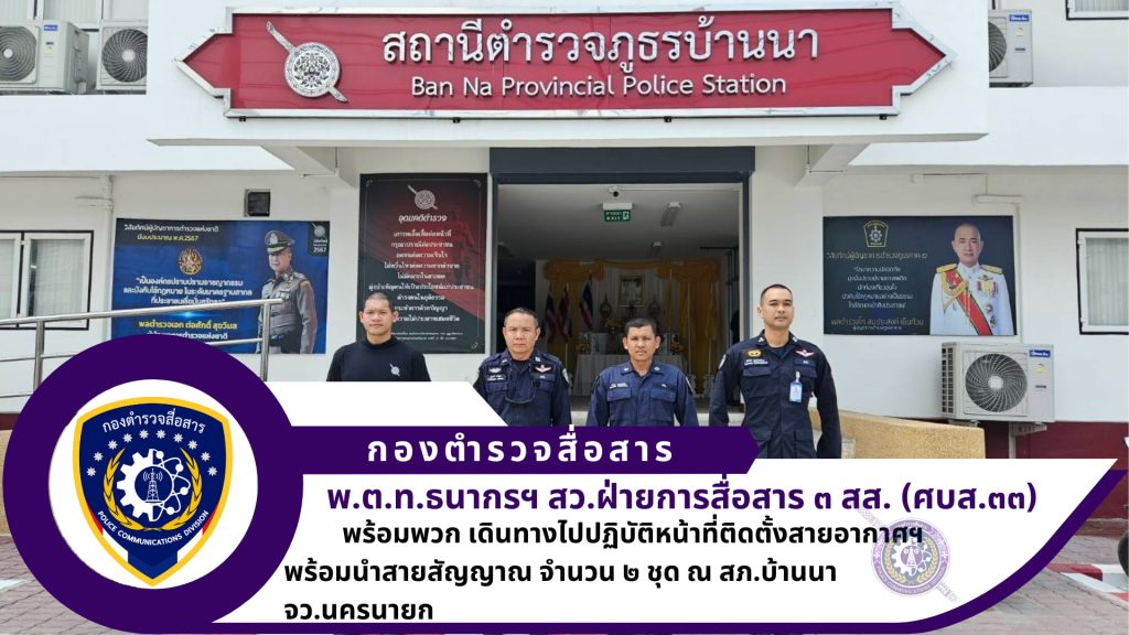 ศูนย์บริการเทคนิคสื่อสาร ๓๓ ฝ่ายการสื่อสาร ๓ สส.นำโดย ว่าที่ พ.ต.ท.ธนากร แก้วมาก พร้อมพวก ปฏิบัติหน้าที่ติดตั้งสายอากาศ foled dipole ๔ ห่วง ๖-๙ dB พร้อมสายนำสัญญาณ จำนวน ๒ ชุด ณ สภ.บ้านนา จว.นครนายก