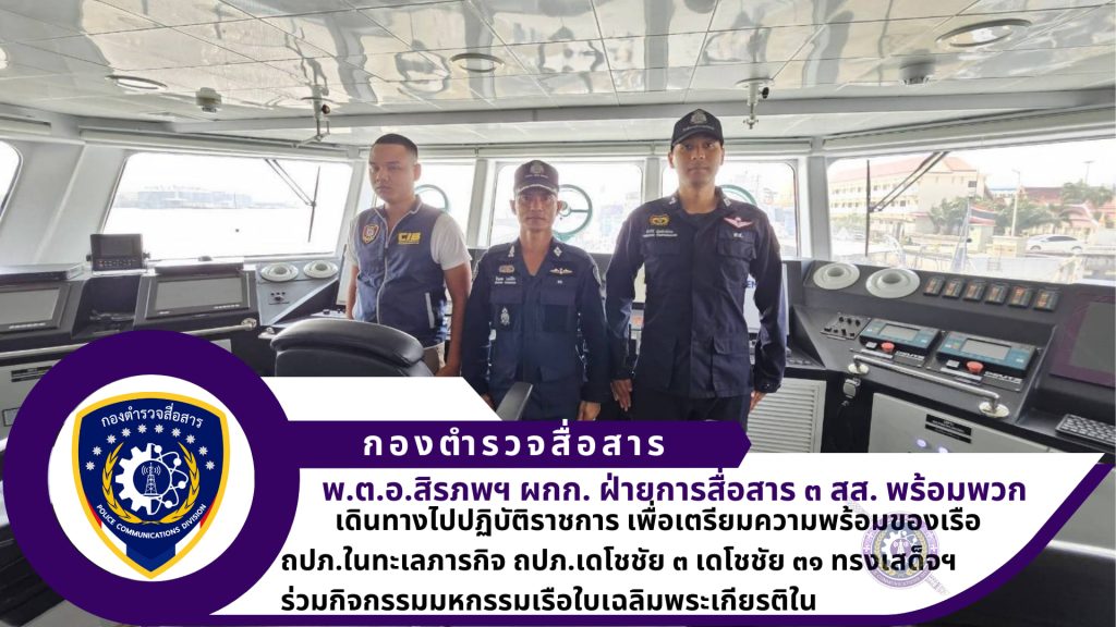 วันที่ ๑๕ เมษายน ๒๕๖๗ พ.ต.อ.สิรภพ วงษ์คำ ผกก.ฝ่ายการสื่อสาร ๓ สส. ร.ต.อ.พีรวีร์ พุ่มพันธ์ม่วง รอง สว.ฝ่ายการสื่อสาร ๓ สส. พร้อมพวกรวม ๓ นาย ติดตั้งวิทยุประจำที่ให้กับเรือตรวจการณ์ บก.รน. ๓ ลำ จำนวน ๔ ชุด โปรแกรมความถี่วิทยุุประจำเรือ สนับสนุนวิทยุมือถือจำนวน ๑๕ เครื่องให้กับ บก.รน. เพื่อความพร้อมของเรือ ถปภ.ในทะเลภารกิจ ถปภ.เดโชชัย ๓ เดโชชัย ๓๑ ทรงเสด็จฯ ร่วมกิจกรรมมหกรรมเรือใบเฉลิมพระเกียรติใน ๑๙ เมษายน ๒๕๖๗