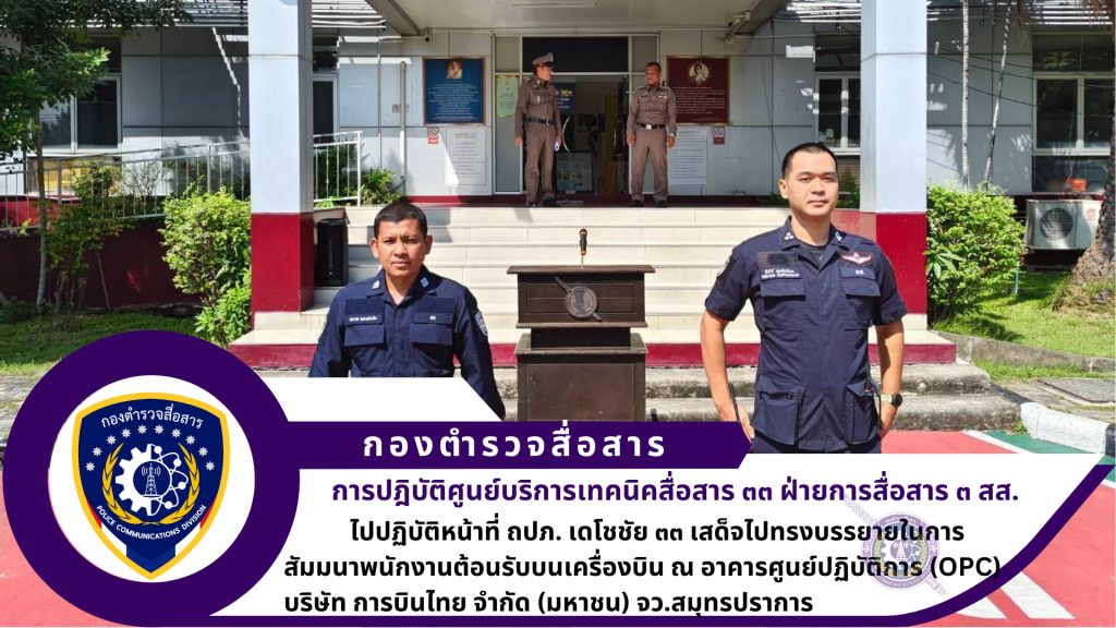 ฝ่ายการสื่อสาร ๓ สส.นำโดย ว่าที่ ร.ต.อ.พีรวีร์ พุ่มพันธ์ม่วง พร้อมพวก ปฏิบัติหน้าที่ถวายความปลอดภัยด้านการสื่อสาร สนับสนุน อุปกรณ์การสื่อสาร ให้กับ สภ.ท่าอากาศยานสุวรรณภูมิ ในภารกิจ เดโชชัย ๓๓ เสด็จไปทรงบรรยายในการสัมมนาพนักงานต้อนรับบนเครื่องบิน ณ อาคารศูนย์ปฏิบัติการ (OPC) บริษัท การบินไทย จำกัด (มหาชน) จว.สมุทรปราการ