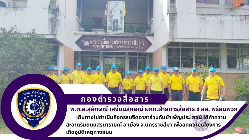 พ.ต.อ.สุลักษณ์ เสงี่ยมลักษณ์ ผกก.ฝสส.๔ สส., พ.ต.ท.พงษ์ศักดิ์ สุขเกษม รอง ผกก.ฝสส.๔ สส., พ.ต.ท.ศักดิ์ชัย ประสพสินธุ์ สว.ศบส.๔๒ ฝสส.๔ สส. พร้อมด้วย ข้าราชการตำรวจ ฝสส.๔ สส. และ ศบส.๔๒ ฝสส.๔ สส. ได้ทำกิจกรรมจิตอาสาร่วมกันบำเพ็ญประโยชน์ ได้ทำความสะอาดริมถนนสุรนารายณ์ อ.เมือง จ.นครราชสีมา