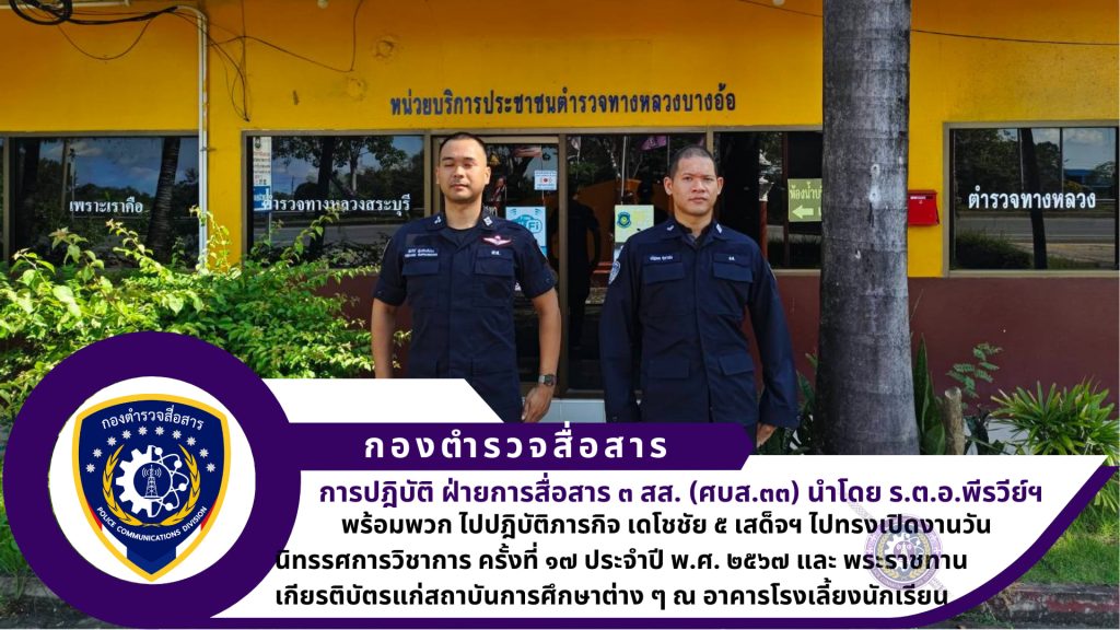 เมื่อวันที่ ๑๘‐๑๙ พฤศจิกายน ๒๕๖๗ ศูนย์บริการเทคนิคสื่อสาร ๓๓ ฝ่ายการสื่อสาร ๓ สส. นำโดย ว่าที่ ร.ต.อ. พีรวีร์ พุ่มพันธ์ม่วง รอง สว. ศูนย์บริการเทคนิคสื่อสาร ๕๑ ฝ่ายการสื่อสาร ๕ สส. รรท. สว. ศูนย์บริการเทคนิคสื่อสาร ๓๓ ฝ่ายการสื่อสาร ๓ สส.พร้อมพวกรวม ๓ นาย เดินทางไปราชการภารกิจถวายความปลอดภัย เดโชชัย ๕ เสด็จฯ ไปทรงเปิดงานวันนิทรรศการวิชาการ ครั้งที่ ๑๗ ประจำปี พ.ศ. ๒๕๖๗ และ พระราชทานเกียรติบัตรแก่สถาบันการศึกษาต่าง ๆ ณ อาคารโรงเลี้ยงนักเรียน โรงเรียนนายร้อยพระจุลจอมเกล้า อ.เมืองนครนายก จว.นครนายก
