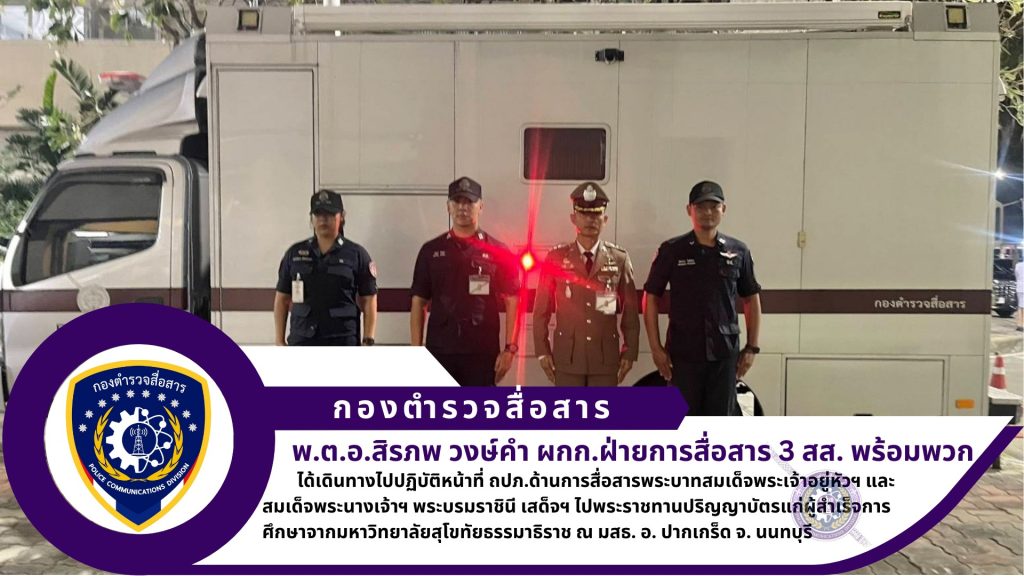 นำโดย พ.ต.อ.สิรภพ วงษ์คำ ผกก.ฝ่ายการสื่อสาร 3 สส. พ.ต.ท.สุชาติ ศรียาเทพ สว.ศูนย์บริการเทคนิคสื่อสารฯ 31 ฯ พร้อมกำลังพล สนับสนุน วางช่ายการสื่อสารพร้อมสนับสนุนเครื่องมือสื่อสารให้กับกองสื่อสารและอิเล็กทรอนิกส์ในพระองค์ กองบัญชาการทหารมหาดเล็กราชวัลลภรักษาพระองค์ สภ.ปากเกร็ด และ มสธ.