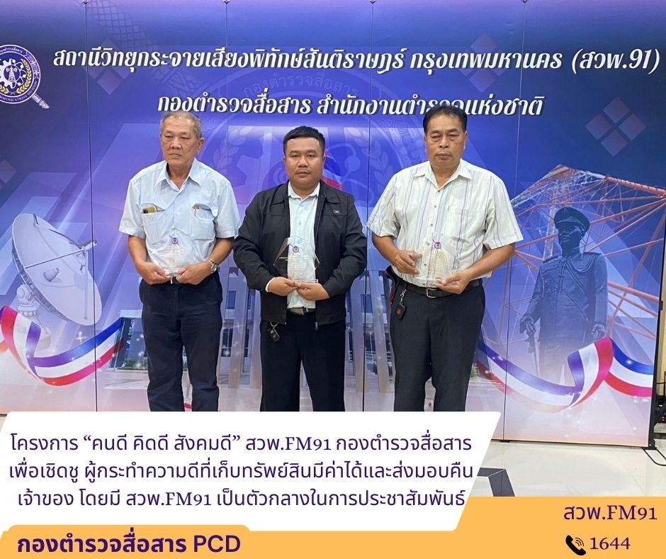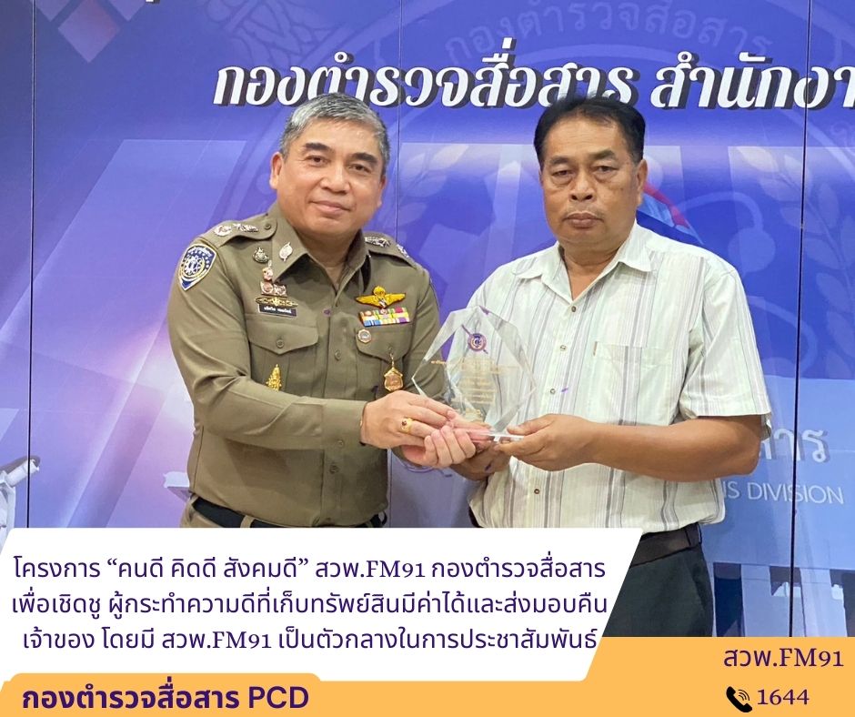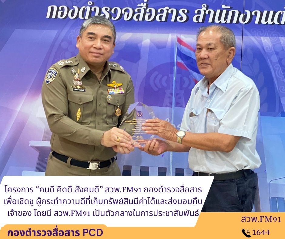 วันที่ 20 ธ.ค.66 มีพิธีมอบโล่ประกาศเกียรติคุณ โดยกองตำรวจสื่อสาร ร่วมกับ บริษัทวิไลเซ็นเตอร์ แอนด์ ซันส์ จำกัด (ผู้แบ่งเวลาดำเนินรายการ สวพ.FM91) คัดเลือกผู้กระทำความดีประจำเดือนสิงหาคม – ตุลาคม จำนวน 3 ท่าน ซึ่งมีอาชีพขัถแท็กซี่ และเก็บทรัพย์สินมีค่าได้และส่งคืนเจ้าของโดยมี สวพ.FM91 เป็นตัวกลางในการประชาสัมพันธ์