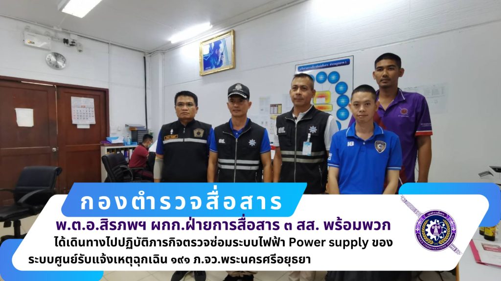 วันนี้ (๒๓ ก.พ ๒๕๖๗) นำโดย พ.ต.อ.สิรภพ วงษ์คำ ผกก.ฝ่ายการสื่อสาร ๓ สส., พ.ต.ต.สุชาติ ศรียาเทพ สว.ฝ่ายการสื่อสาร ๓ สส.(ศบส.๑ อย.) พร้อมพวก ตรวจซ่อมระบบไฟฟ้า Power supply ของระบบศูนย์รับแจ้งเหตุฉุกเฉิน ๑๙๑ ภ.จว.พระนครศรีอยุธยาพร้อมตรวจซ่อมวิทยุประจำที่และโปรแกรมความถี่